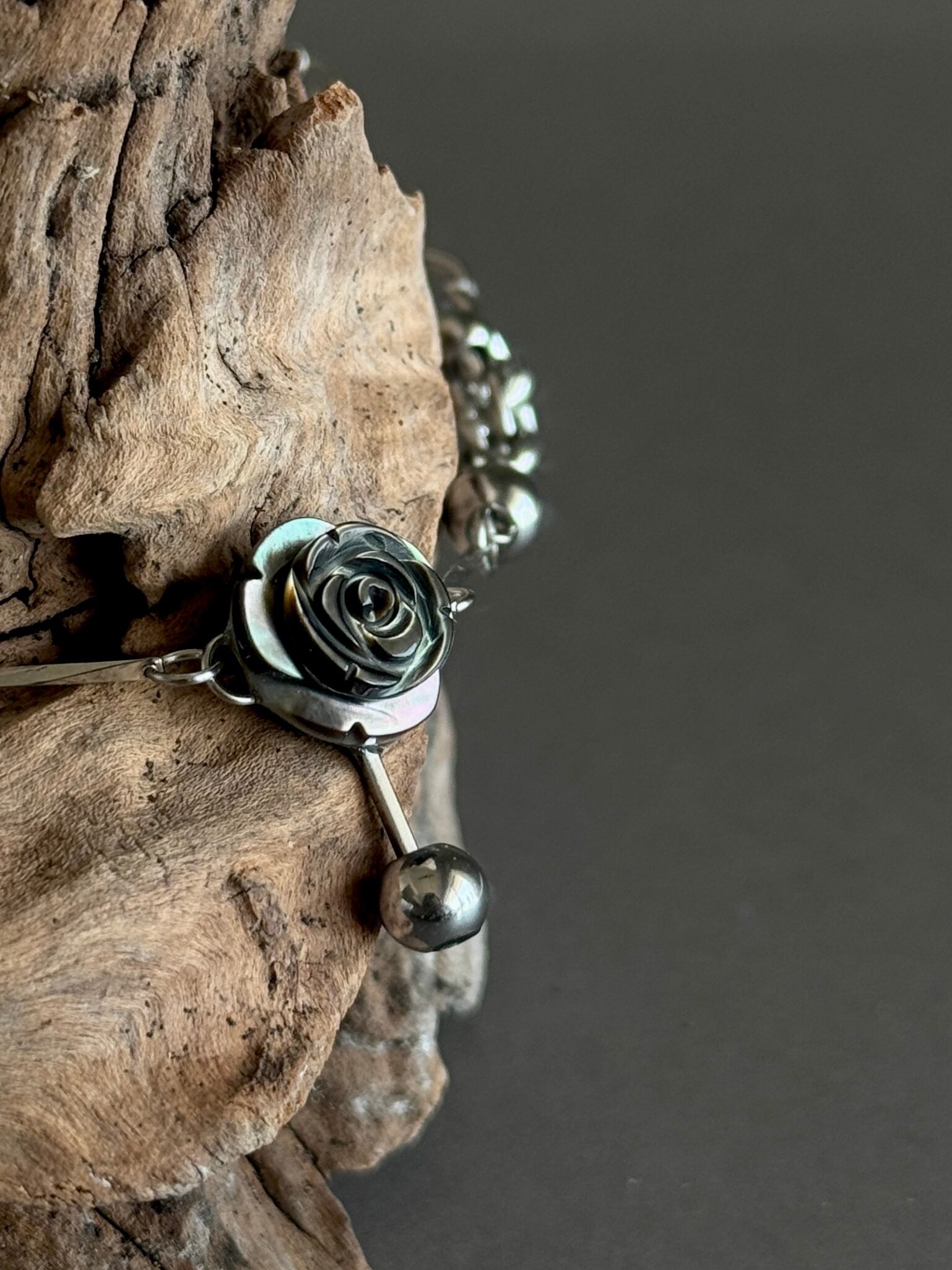 光の角度で深い艶を見せる黒蝶貝は